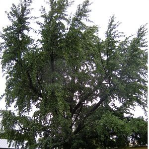 Листопадное, двудомное дерево, достигающее 30-45 м высоты, со стройным коричнево-серым стволом. Крона молодых растений широкопирамидальная, с мутовчатым расположением основных ветвей, отходящих от ствола почти под прямым углом; с возрастом вершина ее притупляется и крона расширяется. Как правило, мужские растения более стройные, с пирамидальной кроной, женские — с более широкой и округлой. Ни одно из современных голосеменных растений не имеет таких декоративных листьев, как у гинкго. Они вееровидные, часто рассеченные на две глубокие лопасти (это отражено в видовом названии), кожистые, голые, слегка гофрированные по краю, сизовато-зеленые, на длинных черешках. Листья расположены одиночно или пучками на укороченных побегах. Осенью они окрашиваются в красивые золотисто-желтые тона, придавая дереву незабываемый облик. Цветки в небольших зелено-желтых соцветиях. Семя покрыто мясистым покровом (подобно сливе), жгуче-вяжущего вкуса и неприятного запаха.