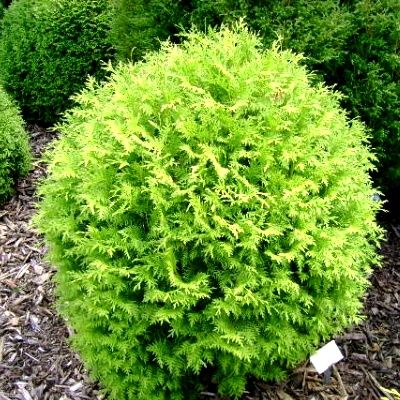 Туя Little Giant Карликовая, шаровидная, с плотной кроной форма туи западной. Растет медленно и достигает в высоту до 0,8 м, а в ширину до 0,4 м. Хвоя в течение лета ярко-зеленого цвета, располагается на плотных побегах, зимой становится бронзово-зеленой. Плотная форма кроны с красивой ярко-зеленой хвоей. Лучше растет на плодородных, влажных почвах